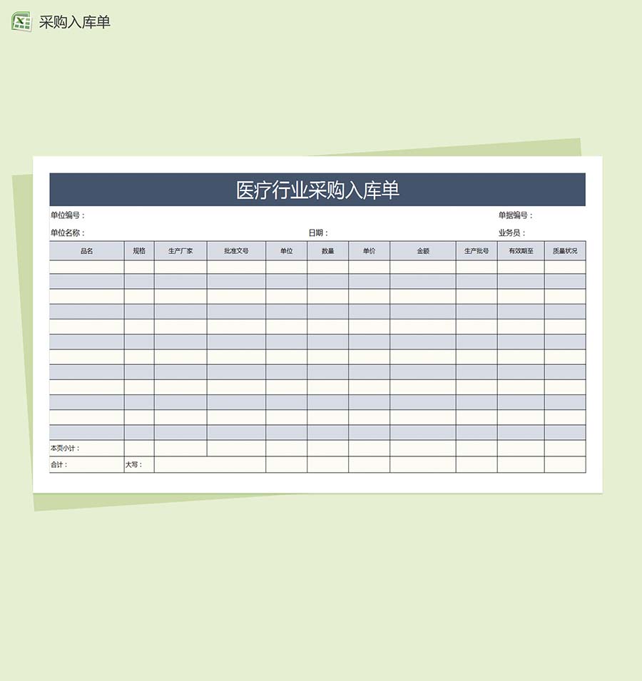 医疗行业采购入库单Excel模板介绍: 格式为xlsx,大小为100KB以内,页数为1,比例为4:3,下载后请使用Excel软件打开,Excel表中的文本和图形可以修改和编辑,图像的修改请右键单击Excel表中的图像和替换,文本的修改请直接单击文本进行修改您还可以添加和删除Excel表的内容。